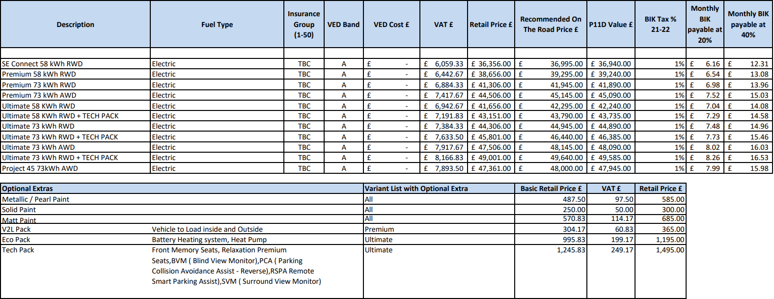 IONIQ 5在英国一共有4款配置版本,由SE Connect、Premium、Ultimate和Project 45,其中SE Connect版本配备58kWh电池组,并且仅有后驱版本;Premium和Ultimate车型提供58kWh后驱、73kWh后驱,和73kWh四驱三种动力总成可以选择,Project 45仅提供73kWh四驱版本。