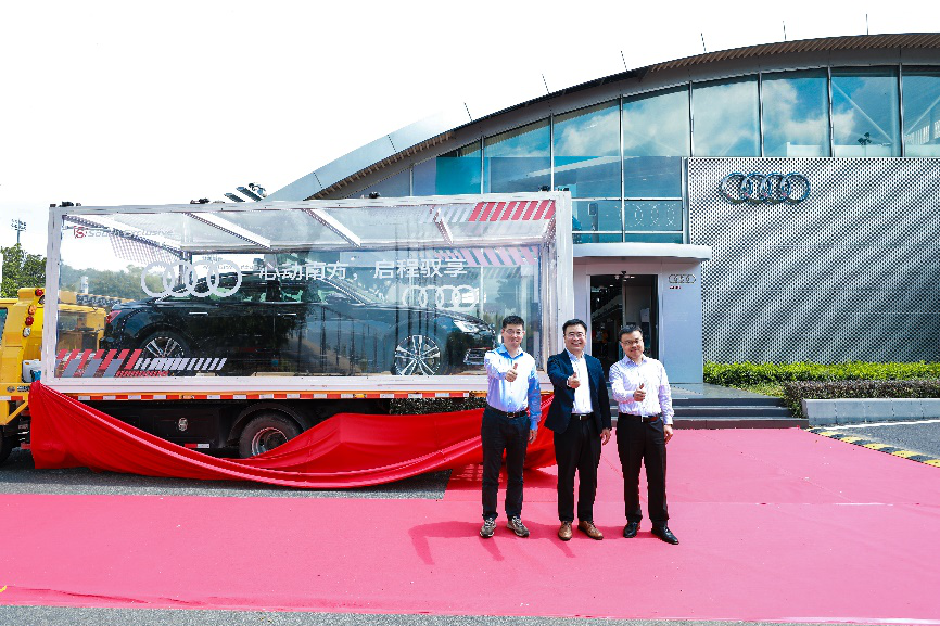 交车仪式当天,一汽-大众产品管理部奥迪中大型车平台部长郭院波先生、一汽-大众产品管理部奥迪紧凑型车平台部长刘宏光先生、一汽-大众奥迪南部区区域总经理胡海峰先生一同来到奥迪A6L南方车型001号车前进行揭幕,开启奥迪南方车型的首次亮相。