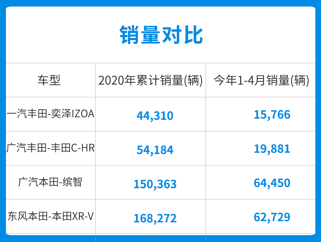 在过去的2020年里,丰田C-HR累计销量54,184辆,而奕泽IZAO还要更低,累计销量仅44,310辆,如果单看这样销量数据,确实比很多车型要优秀,但对比本田两款小型SUV的销量,差距就非常明显。本田缤智去年累计销量150,363辆,XR-V则更为疯狂,去年累计销量168,272辆,是同级别当之无愧的销冠。