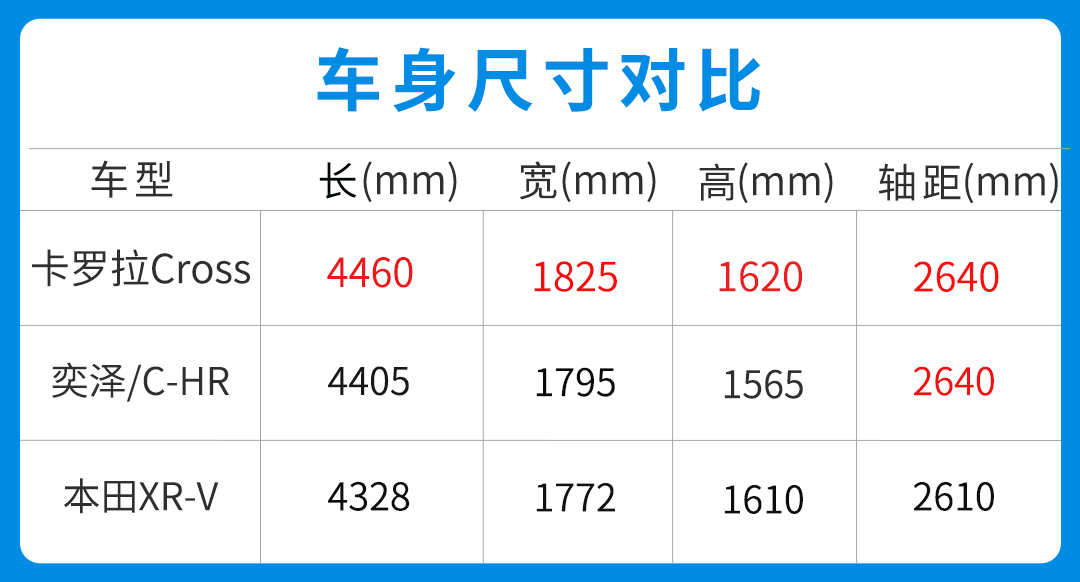 车身尺寸方面,新车长宽高分别为4460/1825/1620mm,轴距为2640mm,与C-HR和奕泽并没有很大差距,从这也可以看出其定位基本与前两者差不多。