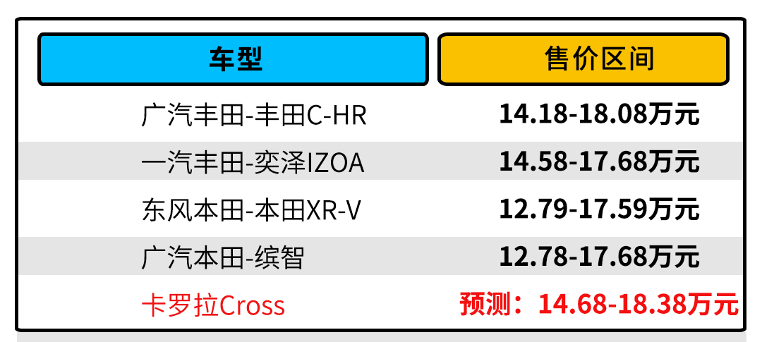 结合目前在售奕泽官方指导价区间为14.58-17.68万元,C-HR官方指导区间为14.18-18.08万元,卡罗拉Cross引进国内的起售价基本不会高于15万元。此外前两者还有近1.4万的优惠,销量都不咋滴,所以买买君大胆预测一下,卡罗拉Cross售价在14.68-18.38万元之间,希望丰田不要打脸买买君。