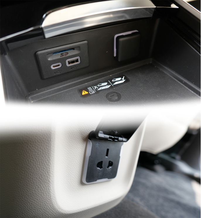 前排电源口非常丰富,包括12V电源、USB/Type-C接口、无线充电面板,轻松能满足各方面的充电需求。值得一提,新车在后排还提供了220V电源,对于日常外出真的很方便。