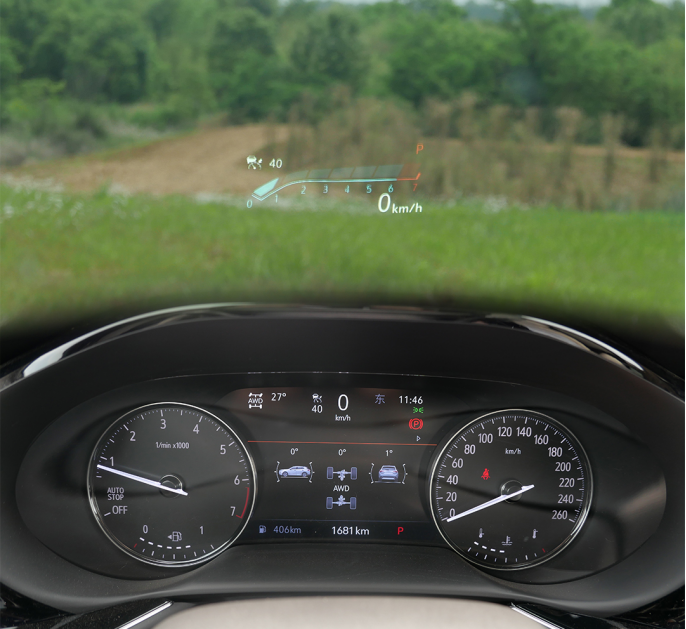 昂科威PLUS艾维亚并没有采用全液晶仪表,但这块8英寸的液晶仪表也能显示足够丰富的信息,包括四驱系统、行车状态、辅助驾驶等。另外,新车还配备了HUD抬头显示功能。