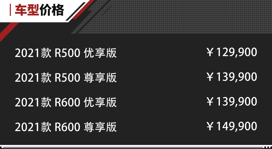 如果只是在城区道路上日常上下班通勤代步的,更推荐购买2021款 R500 尊享版,虽然NEDC续航里程只有416Km,但能享受更高的舒适性配置和更安全的驾驶辅助功能;如果是需要偶尔跑一下长途高速的,还是选择2021款 R600 尊享版吧,能获得更高的科技配置以及长续航的里程;至于入门的R500 优享版和R600 优享版,缺少一些的实用性配置,并不是很推荐你们购买。