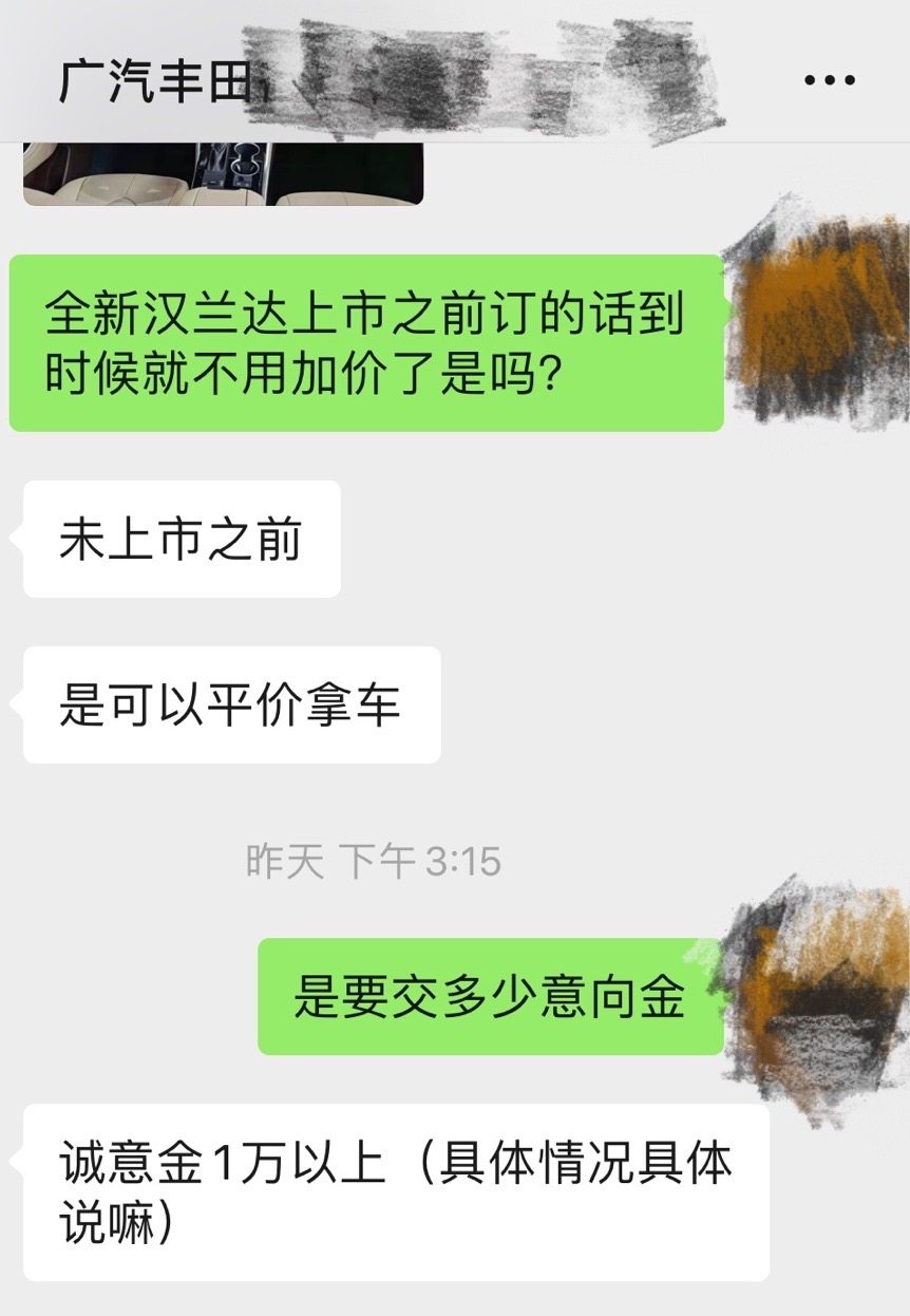 莫急,咱们再来看看全新汉兰达。据4S店的销售介绍,未上市之前下订的话是可以平价拿车的,意向金大概在1万以上(具体金额视4S店而定)。
