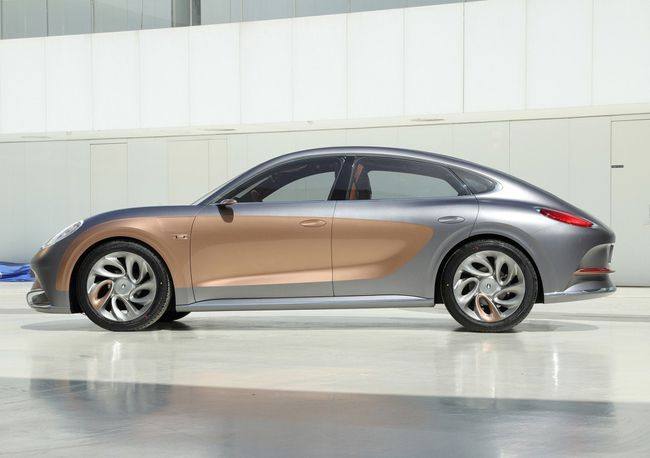 从车身侧面来看,则是以轿跑的风格来呈现,溜背的造型却没有让车身显得短小。该车轴距达到了2800毫米,标准的中型轿车尺寸。流畅的线条也可以明显的让人看出与保时捷Panamera十分相似。