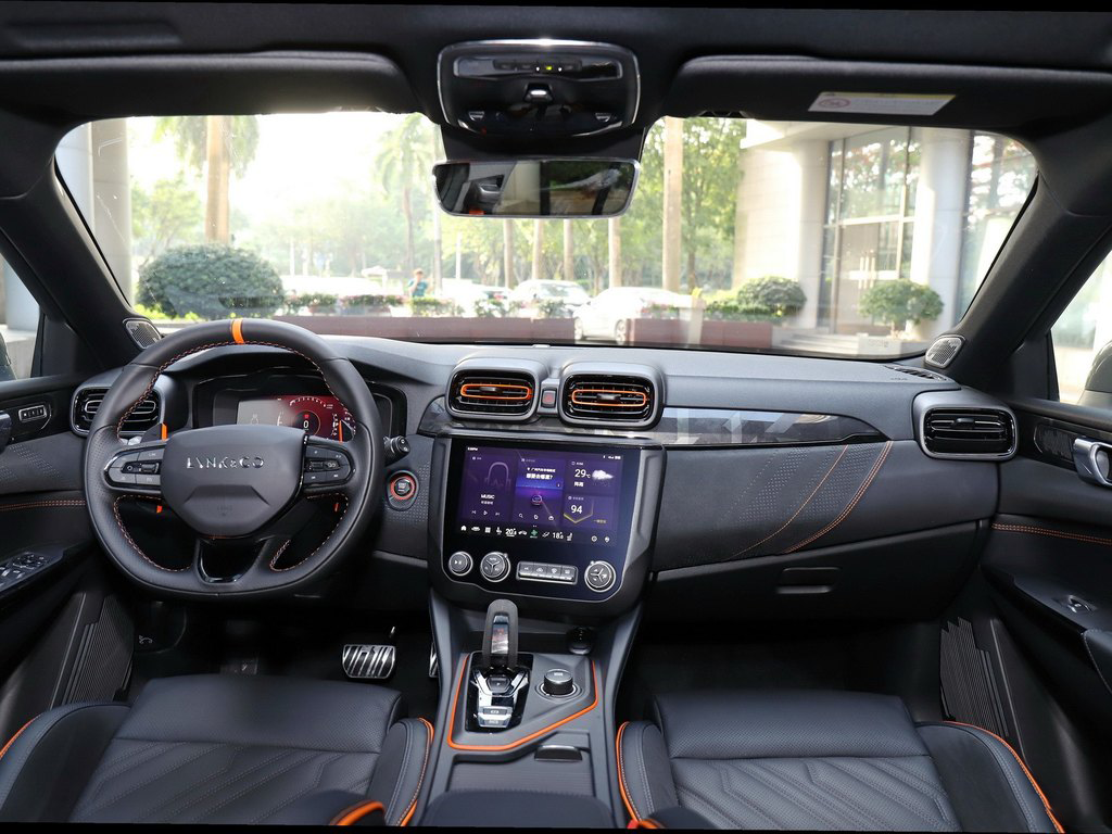 依照惯例还是得先从钢炮的颜值标准来评判一下,远眺望过去,全新橙色+黑色车顶的双拼涂装的确是足够彰显个性。分体式大灯、贯穿式格栅等设计最大限度的保留了领克家族的设计风格。