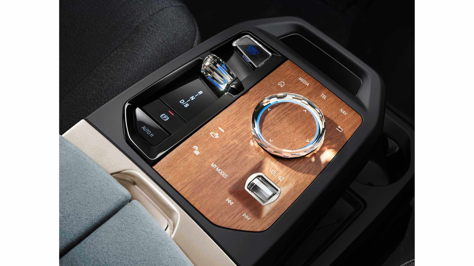 内饰设计方面,宝马iX的内饰设计相较于i4来说比较扁平,直线条也比较多,再加上中控台上的双联屏、简约的木制面板和水晶材质旋钮,都给人一种眼前一亮的感觉。