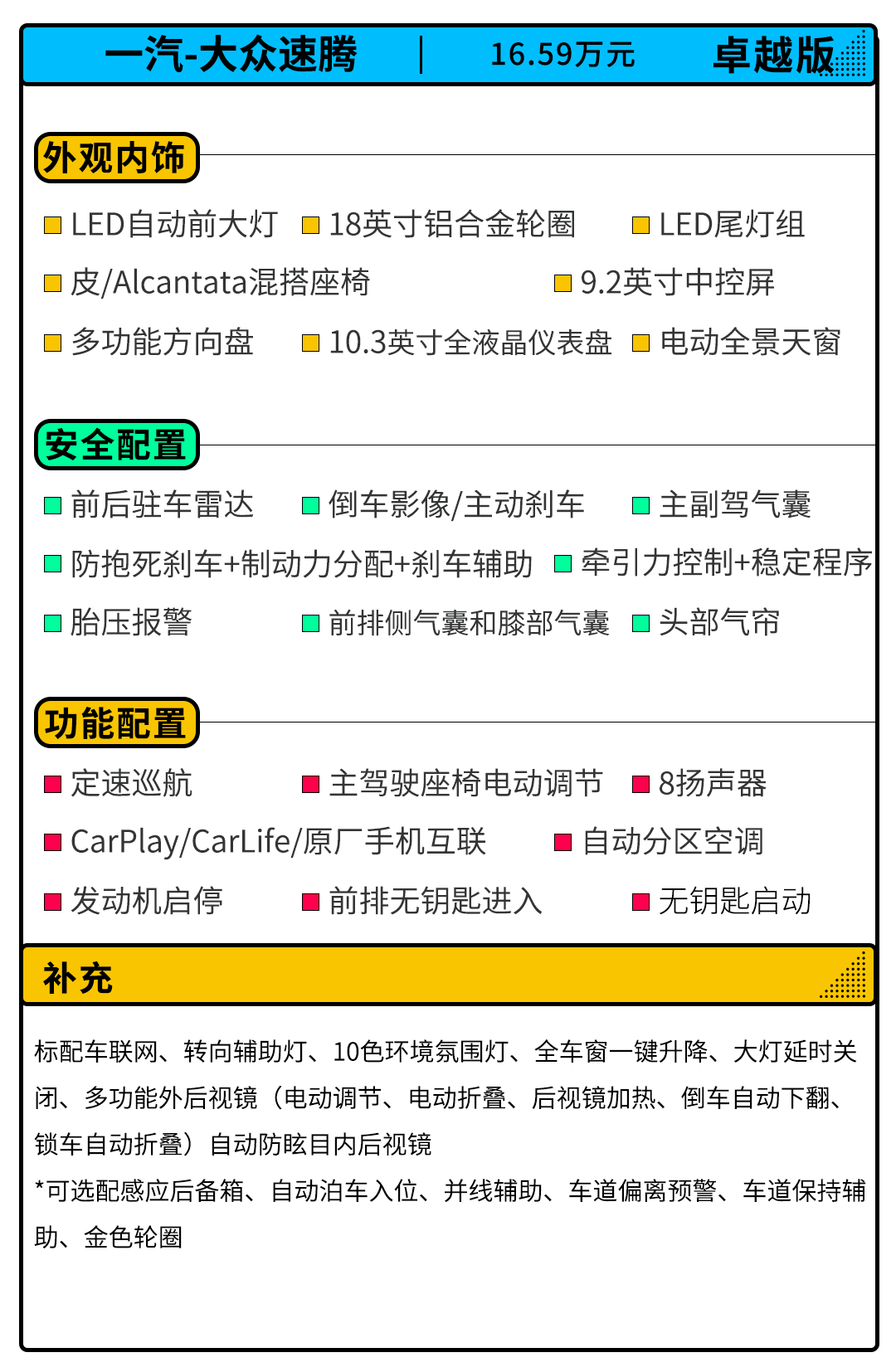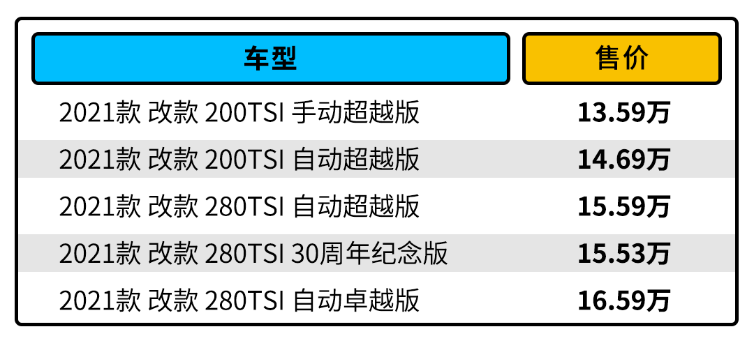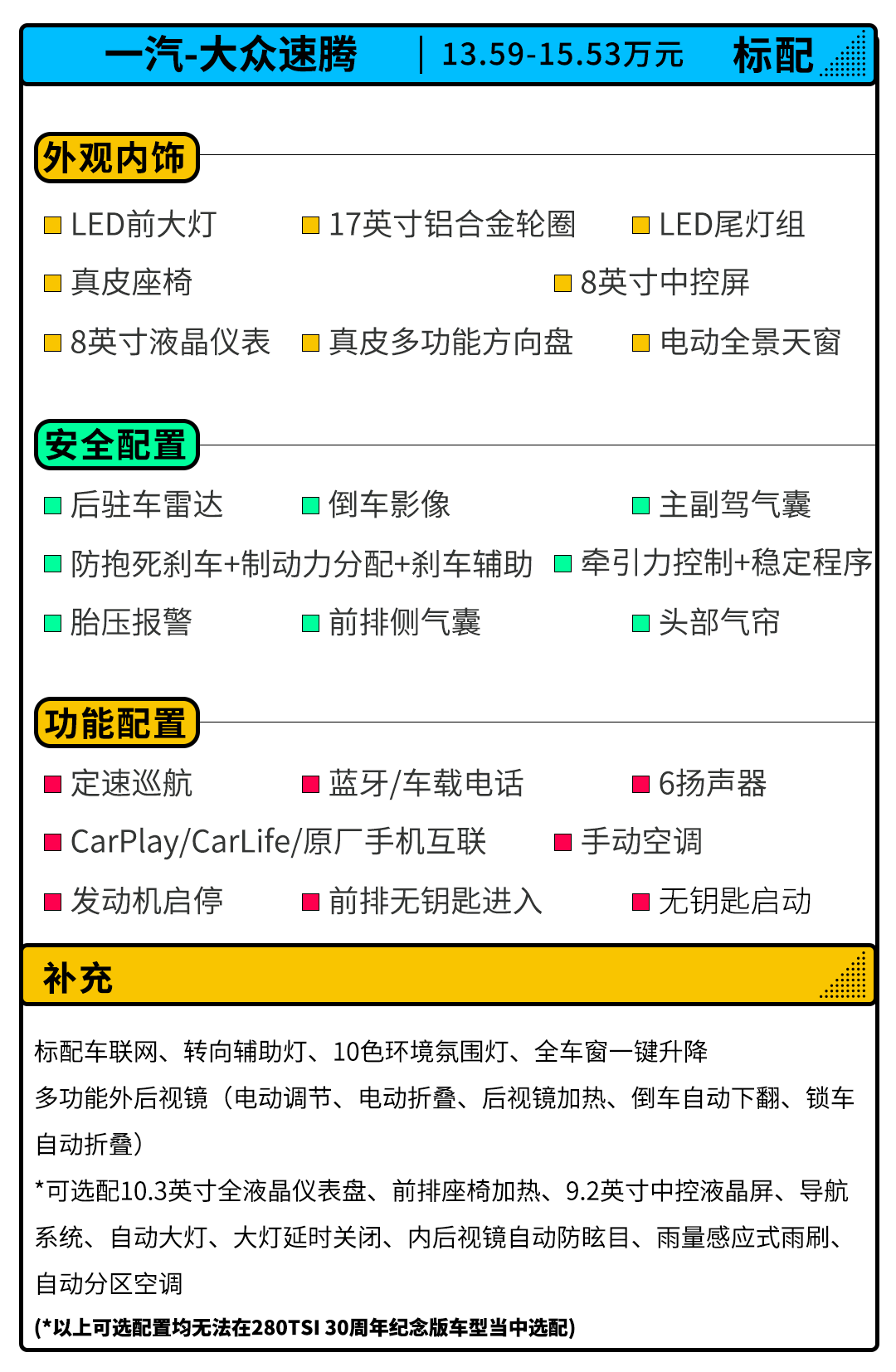 需要说明的是,所有的超越版(含30周年纪念版)都可以视为一个配置等级的,它们之间的区别就在于发动机和变速箱,至于280TSI卓越版,它是速腾车系的中高配车型当中,售价比较优惠的车型。