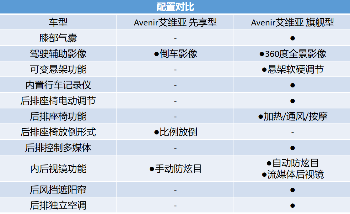 虽说Avenir艾维亚 先享型相较于Avenir艾维亚 旗舰型下调了2.4万元,进一步拉低了门槛,但别忘了羊毛还是出在羊身上的道理,这2.4万元是建立在少配备了膝部安全气囊、可变悬架、内置行车记录仪、后排电动调节、座椅通风/加热/按摩功能、后排多媒体等配置的基础之上。