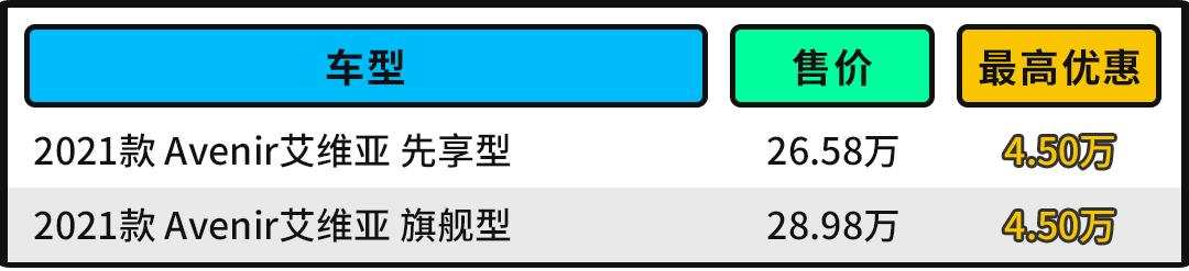 首先就是价格合理,Avenir艾维亚 先享型26.58万元的指导价格,在主流的合资B级车当中,确实是偏高了一点,难能可贵的是,虽然Avenir艾维亚 先享型是刚推出不久的全新版本,但它依旧有较大的价格优惠。