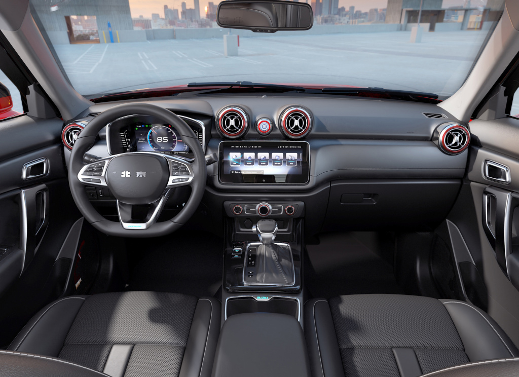在看见这车的第一眼,你会觉得:哦,原来越野起跑线是这样的!辨识度颇高的镀铬U形五孔式进气格栅加上方正的大灯组很有那味,不过尾部悬挂小书包的备胎设计并没有延续。内饰圆形出风口,中控大屏、红黑配色等家族化设计在它身上也能看到。配置有点越野味,10万级产品搭载360度全景影像和底盘透视监测很不错。