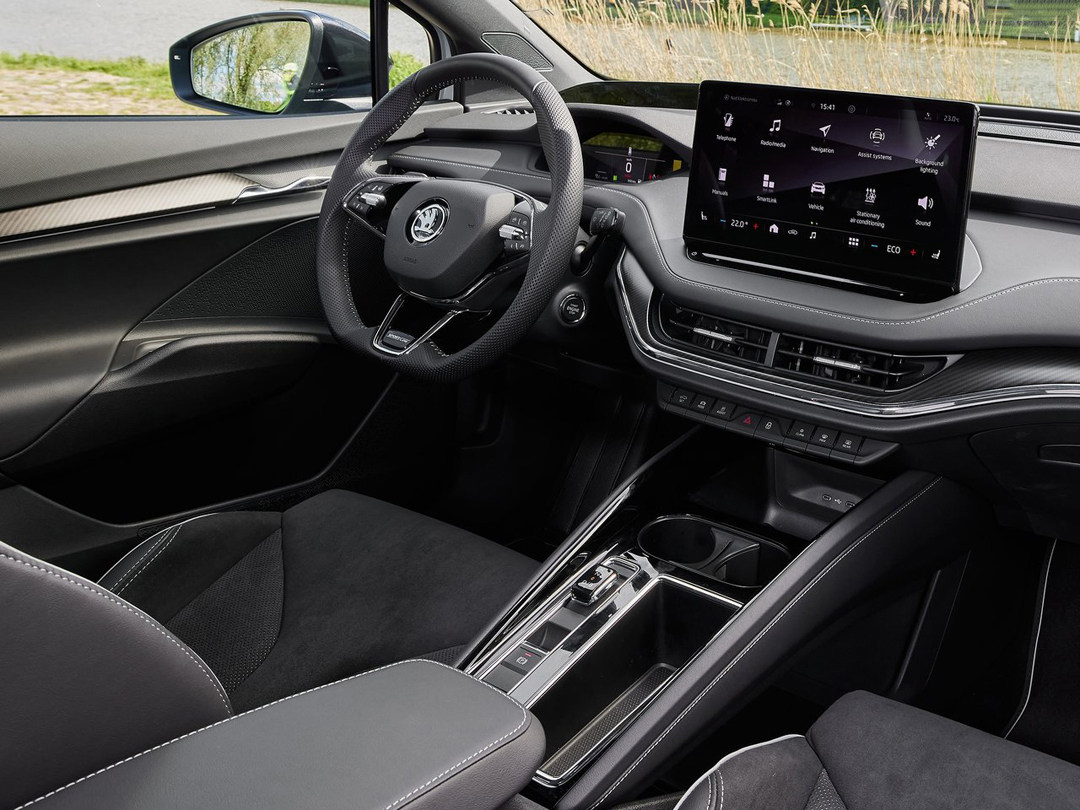 整体造型继承了斯柯达的家族风格元素,例如中网以及头灯,但在此基础上加入彰显新能源的元素,例如中网使用透明封闭式设计,与车身众多熏黑的面料形成强烈对比。