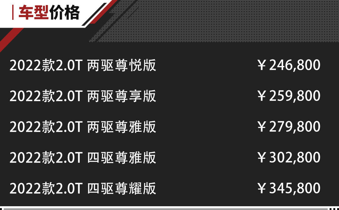 新款冒险家全系共有5款车型,综合全部配置来看,教授认为更推荐选择2022款 2.0T 两驱尊雅版,2.0T发动机搭配前驱系统,应对城市道路上驾驶都能做到游刃有余,得益于较强的动力输出即使是变道超车都能获得一个快速的响应。
