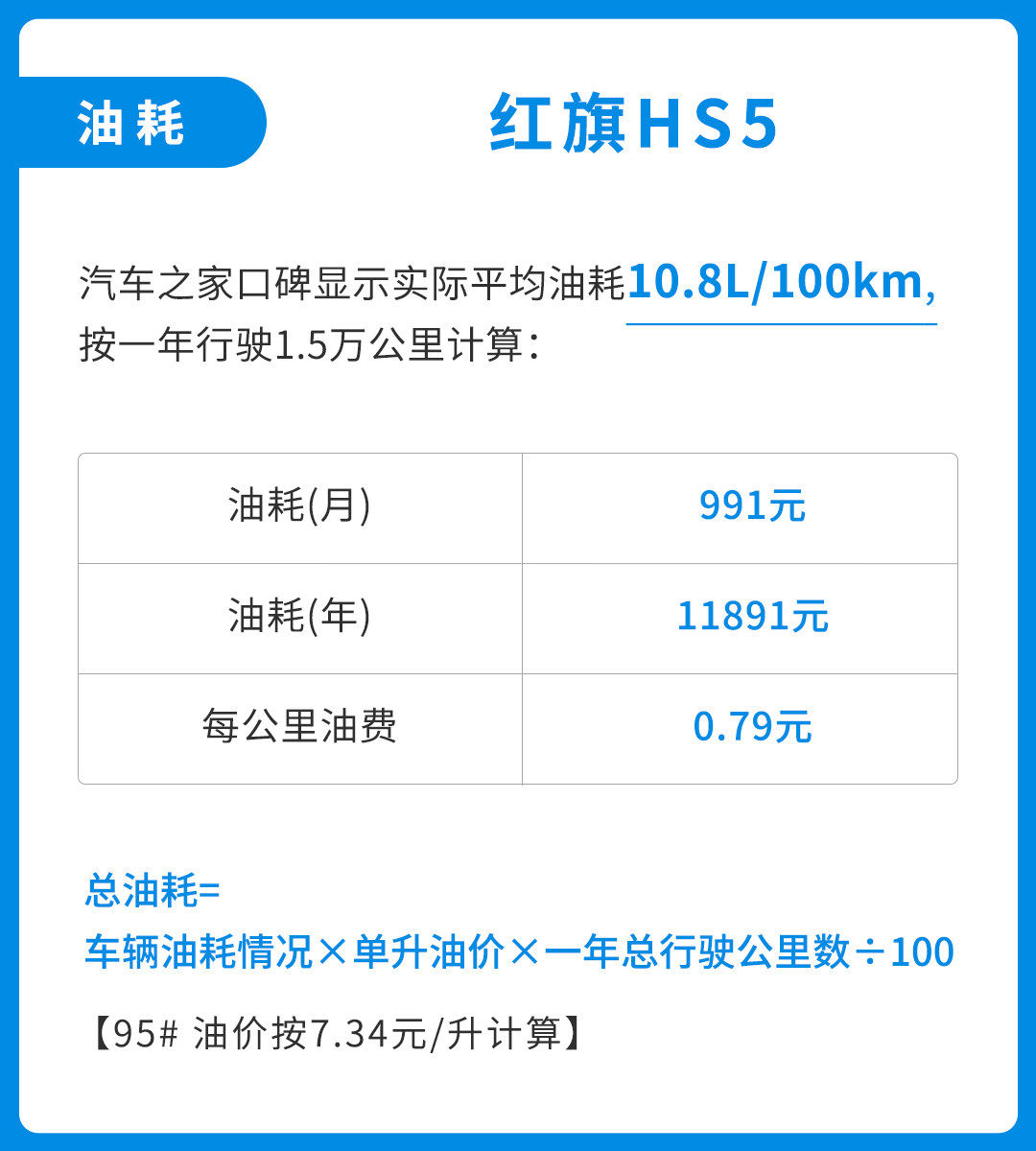 而且后期用车成本方面,根据车主们的反馈,重量超过1.8吨的红旗HS5,百公里油耗大约是10.8L,按照目前95号汽油的价格计算,每公里0.79元的成本也足够实惠。