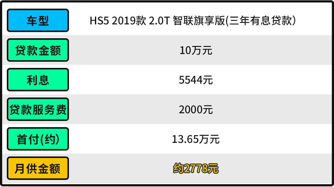 而且对于很多家庭用户而言,按照三年有息贷款方案计算,首付不到15万元就能把一辆中配的HS5开回家了,而且月供也不过是2778元,哪怕只是月入8000元,也不会有太大压力。
