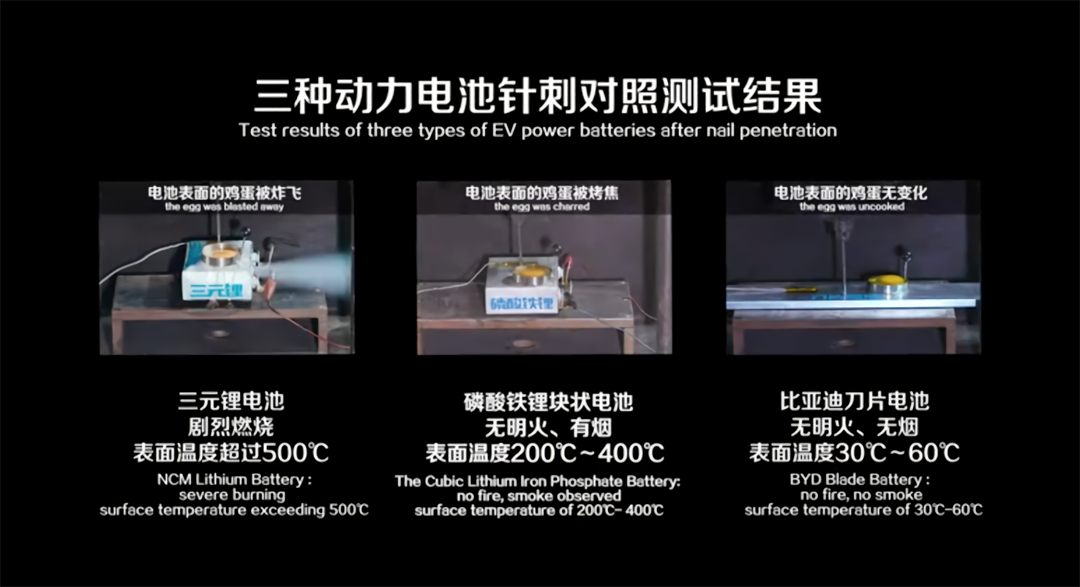 而如今在电池研发方面,比亚迪去年也是凭借磷酸铁锂材料打造的刀片电池引发广泛的关注,其中最具议论度的莫过于针刺试验。由于磷酸铁锂材料有着放热慢、产热少、不释氧特性,相较三元锂电池拥有更高的安全性,在被钢针穿透后并没有燃烧以及冒烟等剧烈反应。