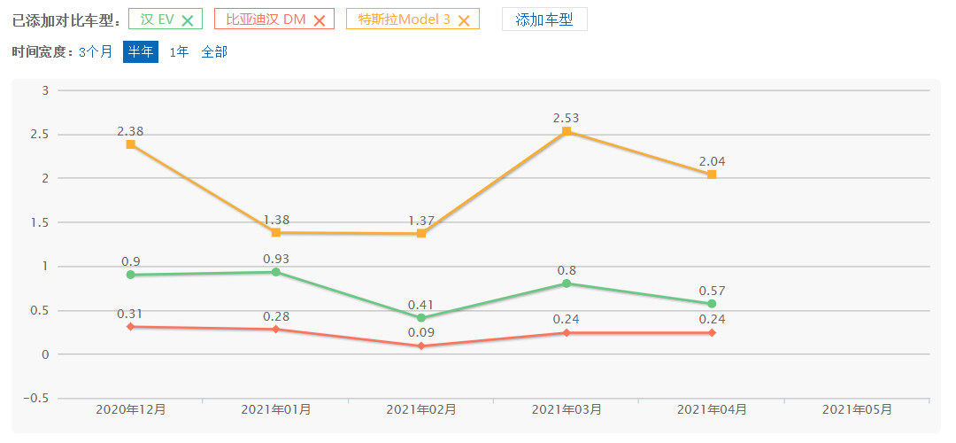 从4月份的销量来看,特斯拉Model 3的单月销量为20438辆,而比亚迪汉仅有8177,这样的结果确实在我的意料之中,但同时也在我的意料之外。