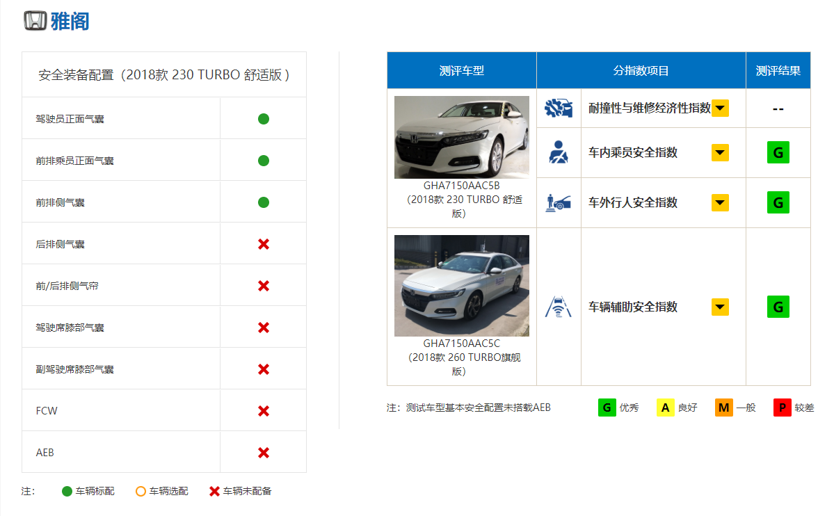 在安全配置方面,前后排侧气囊、被动行人保护、制动力分配、车身稳定系统、牵引力控制等安全功能均得到了标配。根据中保研在2018年评级依照中国保险汽车安全指数测试评价规整标准下。十代雅阁230 TURBO舒适版低配车型在安全配置测试中的各项标准均达到了G级的优秀级别。