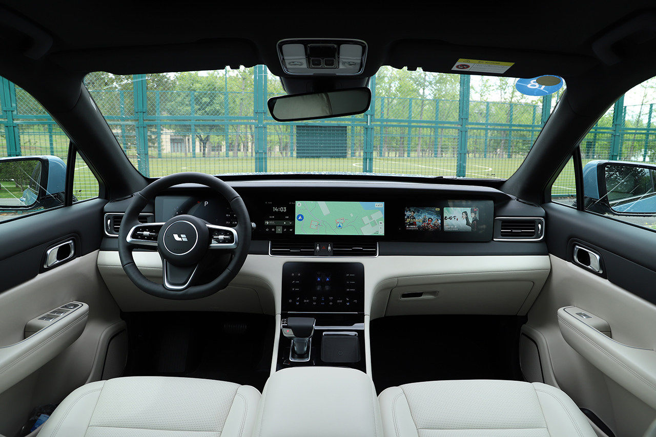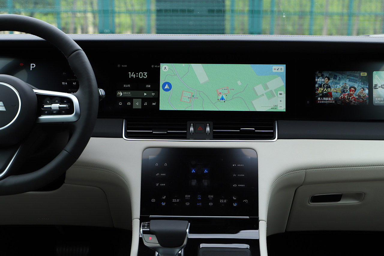 进到车内,还是熟悉的“配方”,继续使用了三联屏设计,从驾驶位一直贯穿至副驾驶,并在中控台下方还单独配了一块10.1英寸屏幕,形成了四屏交互系统,带来了更好的人机交互体验感,还营造出更浓厚的科技氛围感。