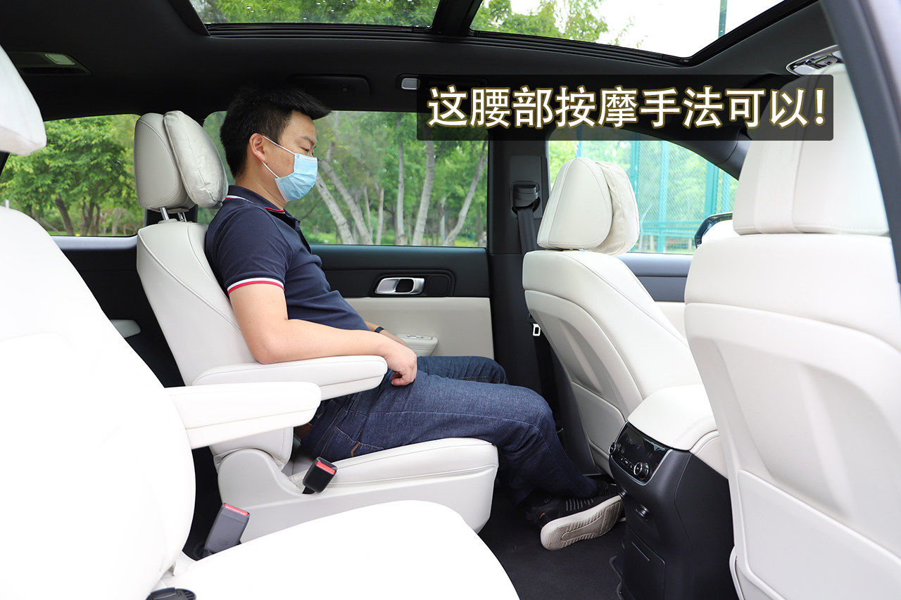 空间部分,以教授180cm的身高,在前排调整好合适的坐姿后,头部还要有一拳的空间剩余。而保持前排座位不变,第二排空间座椅调至最前,腿部还能剩余三指的距离,调至最后则剩余两拳的空间,头部空间剩余三指。