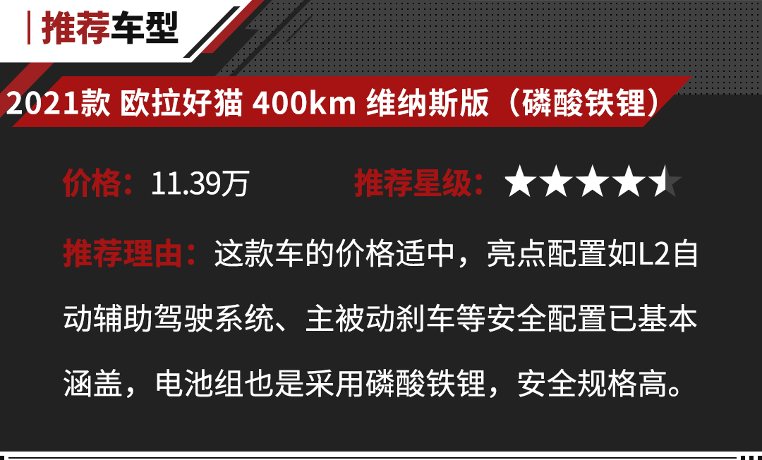 欧拉好猫目前有两种续航版本共计11款车型在售,而综合价格、配置以及安全问题,教授更倾向推荐官方指导价为11.39万的2021款 欧拉好猫 400km标准续航 维纳斯版 磷酸铁锂电池版本。