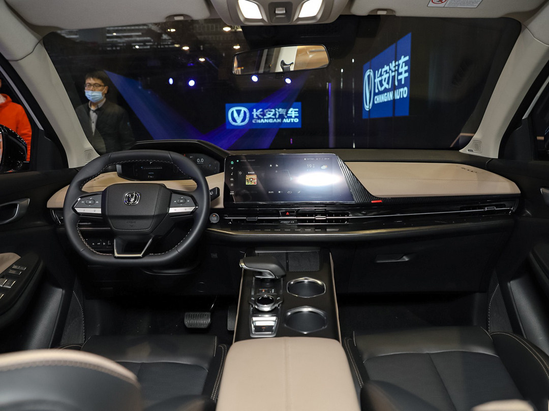 大嘴式点阵格栅灵感来源于UNI系列,与狭长的头灯相连,强化车辆时尚、运动感,红色的饰条是长安PLUS家族标志性元素,高级感与线条共显。