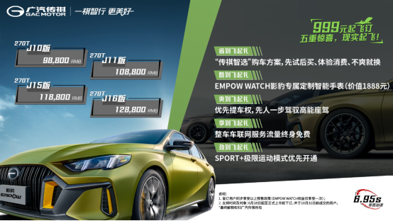 首先最具吸引力的政策是“先试后买”:根据“传祺智选”购车方案,消费者交付1万元押金后,每月只需888元月租,就能获得影豹一年体验权!一年后如确定购买原车,押金及月租可直接抵扣购车款!如不满意,也可选择换购传祺其它车系。不仅给够用户充分体验影豹的时间,也给用户“第二次”选择的机会,简直省到飞起!此外,随订赠送的EMPOW WATCH影豹专属定制智能手表(价值1888元),一抬手就是街头酷盖,酷到飞起;整车车联网服务流量终身免费,每月轻松省出“史诗”皮肤钱,享到飞起。除了真金白银的实惠,预售期间下订,还可以提前解锁SPORT+极限运动模式,开挂般的速度激情和“天使咆哮”排气声浪先人一步,劲到飞起!优先提车权更能先人一步驾驭高能轻跑,解锁朋友圈晒车首秀,爽到飞起!