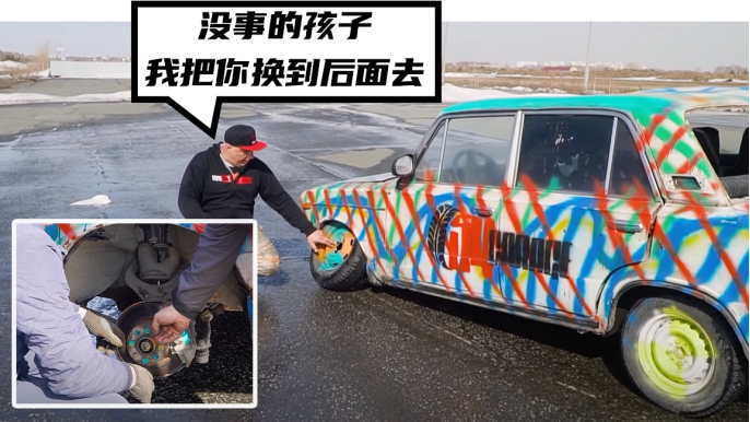 由于另外四个轮圈没有带过来,于是他决定把前轮暂时放到后轴上,并且用垫片加固后继续用。这毕竟是一台前驱车,谁在乎后面用啥呢?!