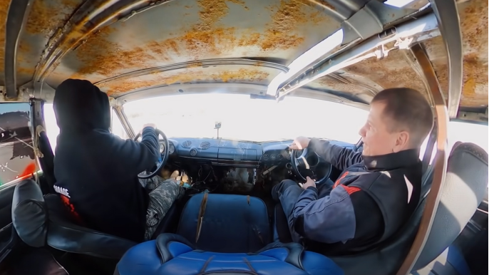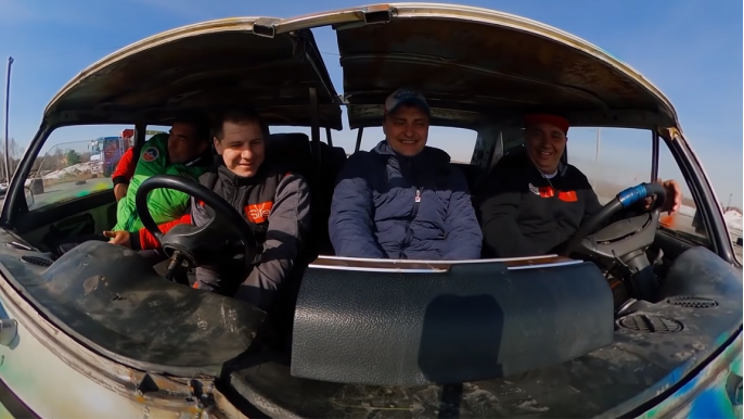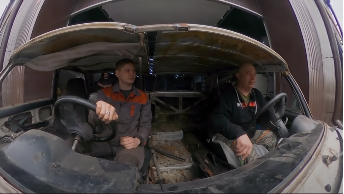 此时此刻,正副驾已经不适用了,正负驾驶员才对,两人在转弯的时候必须保持动作统一,而且需要同时双方的油门配合,如果不这样做,单靠一边车轮的力量是很难推动将这台强行被加重、加宽的“新拉达”。