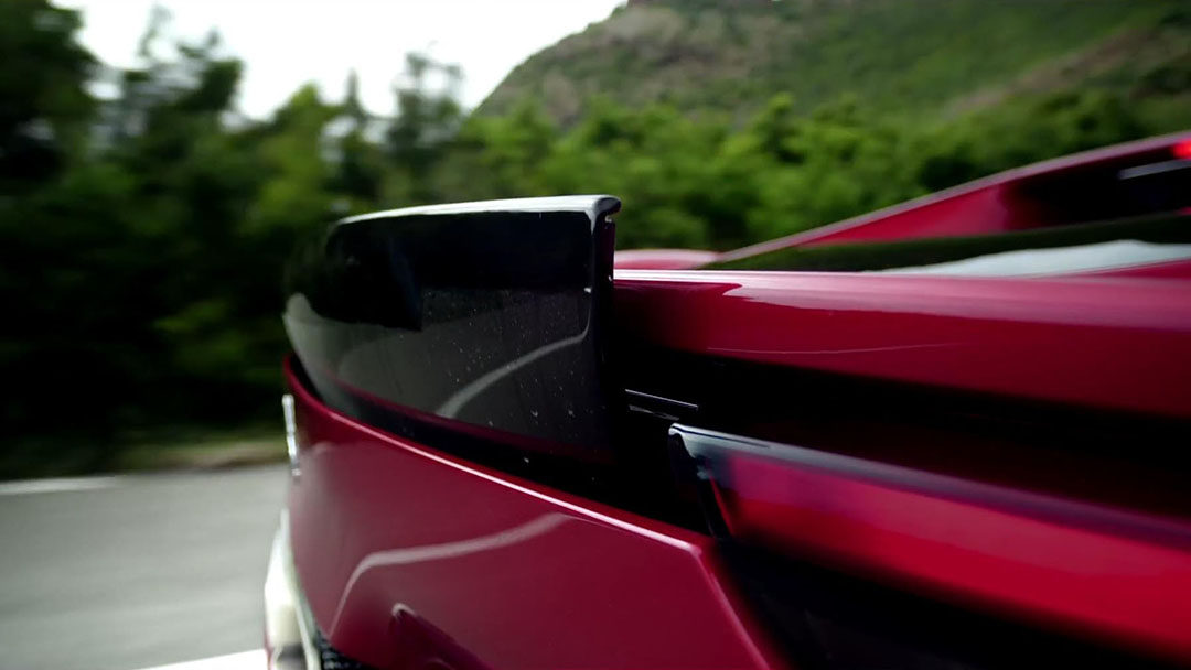 车顶与经典Spider风格的引擎盖之间还设计了一块不起眼的悬浮翼面,用于引导顶部气流吹向引擎盖后方,尾翼两端的冷却系统进气口。