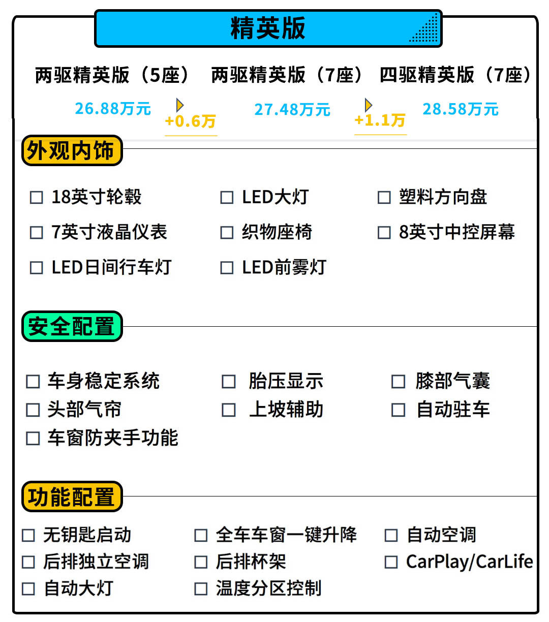 首先我们来看精英版,精英版共有共有三款车型,分别为两驱精英版5座、两驱精英版7座和四驱精英版7座,其中7座比5座贵了0.6万元,四驱比两驱贵了1.1万元。