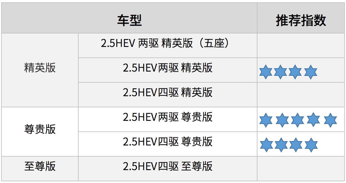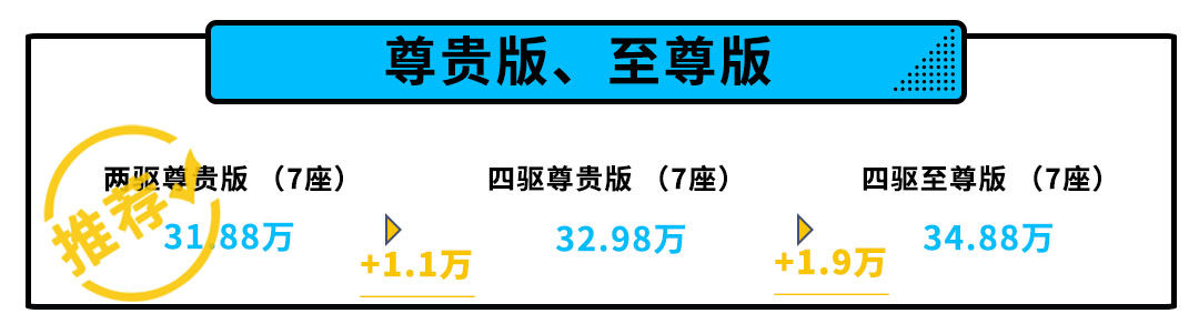 经过一番比较,在6款车型中,买买君最推荐两驱尊贵版,售价31.88万元,其次四驱尊贵版和两驱精英版。