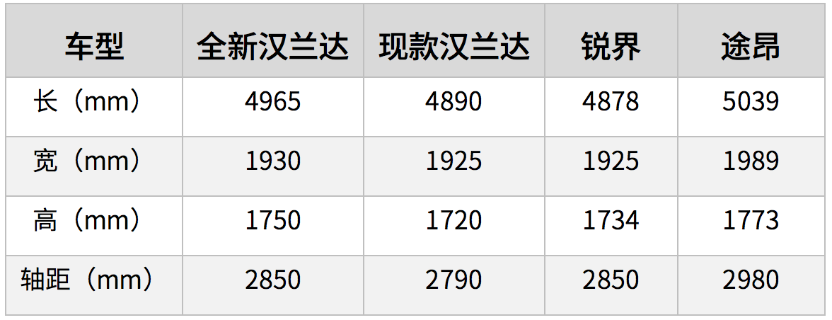 新车的长宽高分别为4965/1930/1750mm,轴距为2850mm,相比现款车型,车身尺寸有了全方位的提升。与同级的锐界相比,车身长度和宽度有着一定的优势;不过与途昂相比,还是略显吃亏,但考虑到途昂为中大型SUV,而汉兰达则为中型SUV,并且前者的售价也更高一些,所以也就不会觉得有多大毛病。