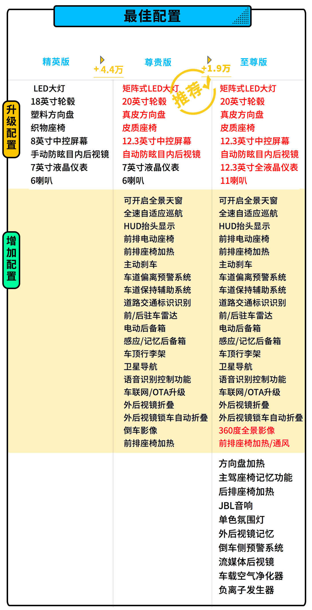 尊贵版比精英版贵了4.4万元,主要升级20英寸轮毂、矩阵式LED大灯、真皮方向盘、皮质座椅和12.3英寸中控屏幕;并且增加了全景天窗、车联网、前排电动座椅/加热、感应后备箱、车顶行李架、后视镜折叠凳等,舒适性和豪华感得到了较大提升。另外尊贵版还增加了全速自适应巡航、HUD显示、主动刹车、驻车雷达、倒车影像、车道偏离预警系统等,安全性配置和用车体验也得到了明显提升。