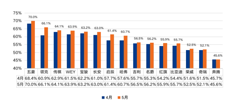 具体来看,五菱汽车凭借70%的保值率高居第一,这主要是因为五菱旗下产品主打10万内的市场,注重实用性,并且采取低价入市策略,起售价基本接近极致的性价比,后期能够折价的空间相对较小,再者五菱旗下产品的机械质素口碑也极为出众。