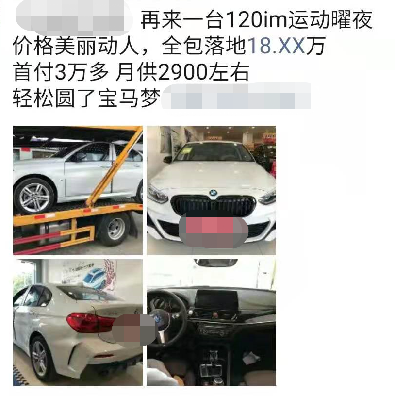 该条pyq的内容大致是这样的,“XX汽贸 宝马1系120im运动耀夜版 全包落地18.XX万 首付3万多 月供2900左右 轻松圆宝马梦。”