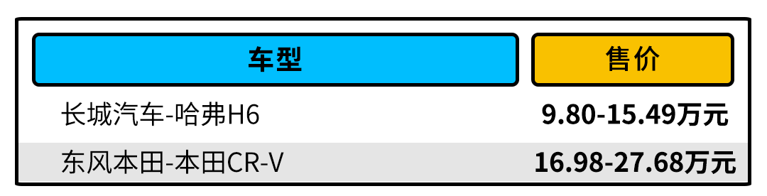 价格是众多消费者购车时的绝对性因素,目前现款在售的哈弗H6官方指导价区间为9.80-15.49万元,涵盖两代车型以及十几款配置供消费者选择,选择性可谓十分丰富,一定会引起你的纠结症;而现款在售本田CR-V官方指导价区间为16.98-27.68万元,同样提供燃油版和油电混合版等多款配置车型,在车型丰富度方面不亚于哈弗H6。