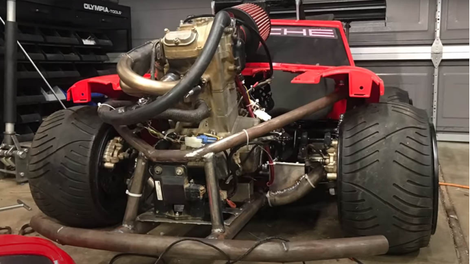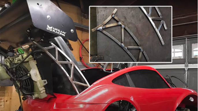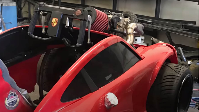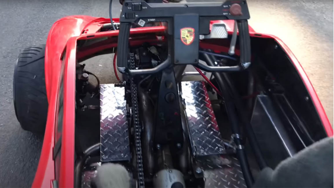 既然底子里只是一台摩托,那自造汽车方向盘、方向机就必不可少,但别忘了忘贴上保时捷的LOGO。