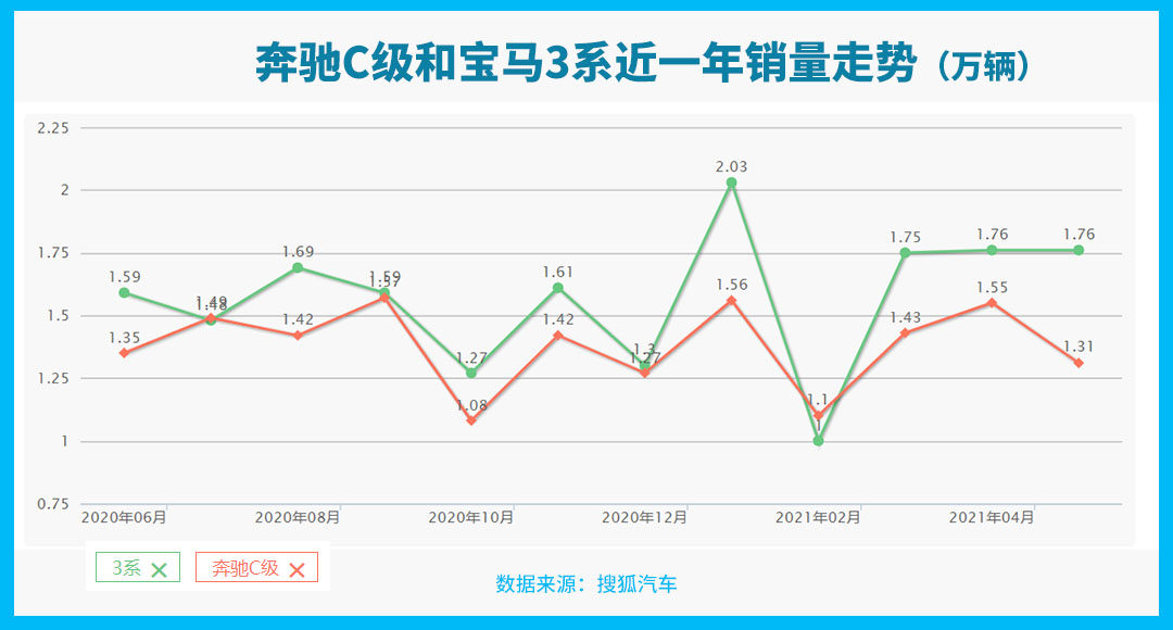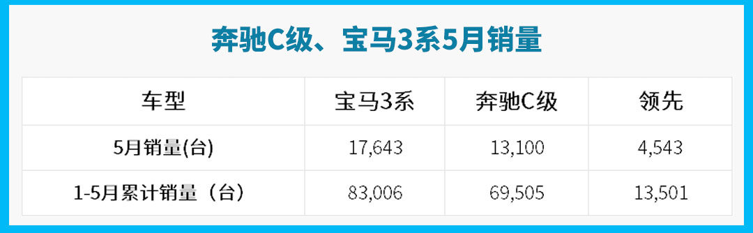 在刚刚过去的5月份,宝马3系销量为17,643台,奔驰C级销量为13,100台,宝马3系领先了4,543台;而今年1-5月,宝马3系更是领先了1.35万辆,这要是放在半年前,是很难想到的。