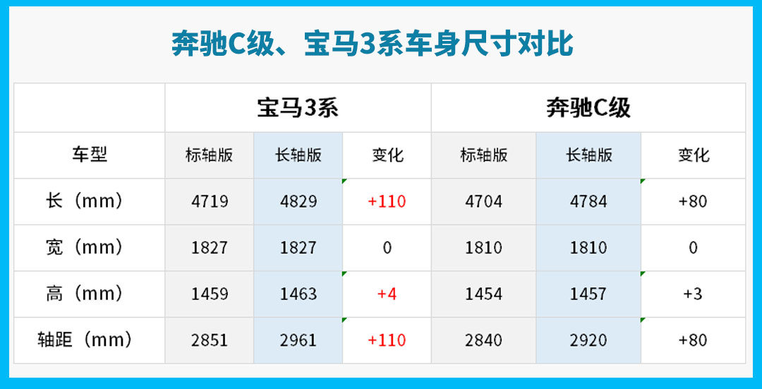 基于CLAR平台打造的全新一代宝马3系,车身尺寸进行了全面加大,无论标准轴距版还是长轴距版,都要比(迈入产品生命周期末端的)奔驰C级更有优势。并且针对中国市场,宝马3系对车身长度和轴距做了更大幅度的调整。