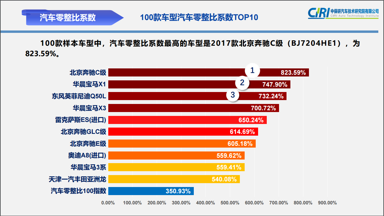 我们从中保研汽车技术研究院发布的《100款车型汽车零整比系数TOP10》来看,奔驰C级高举榜首,零整比为823.59%,宝马3系虽然也比较靠前,但559.41%的零整比还是比奔驰C级低了不少。