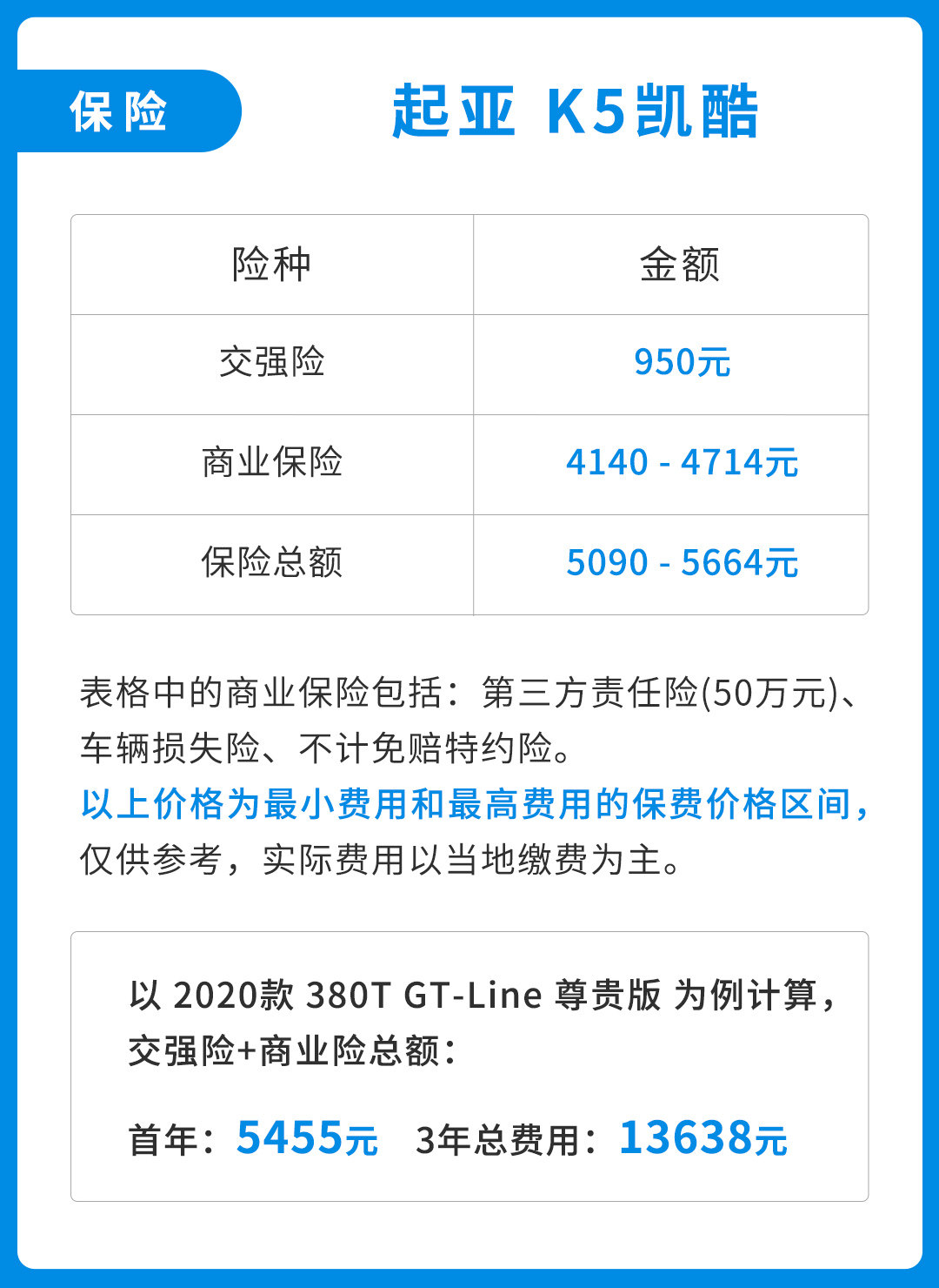 在保险方面,K5凯酷全系的商业保险费用区间为4140~4714元,加上950元的交强险后,每年的保险费用区间为5090~5664元。