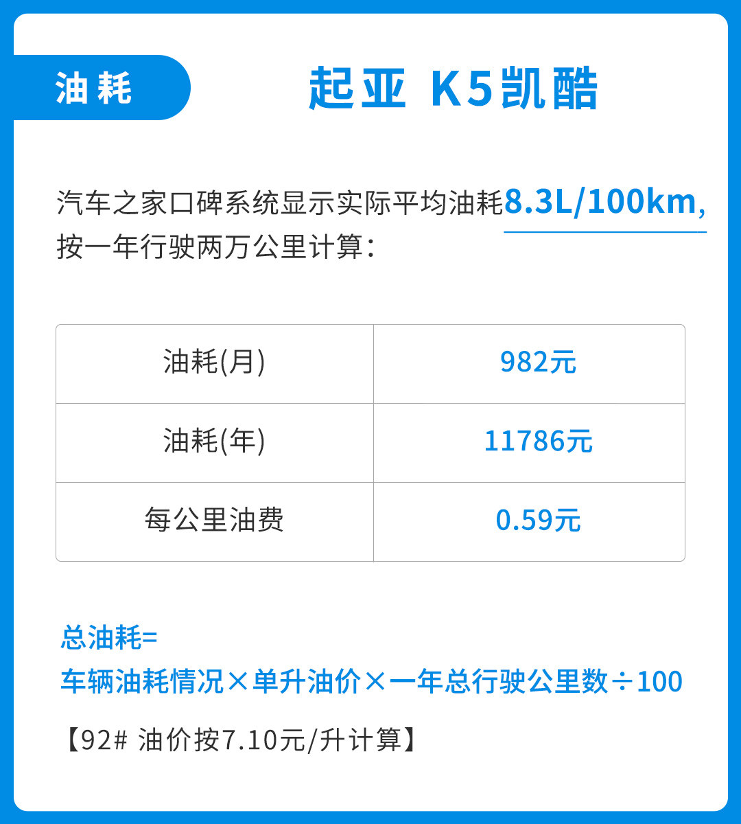 在综合燃油、车险以及保养后,起亚K5凯酷一年的养车成本总支出为18890元,看上去虽然有些偏高,但目前过高的油价是车辆养车成本较高的主要原因。如果单看保养以及保险方面,K5凯酷的表现还是要比许多同级别竞品车型更低的。