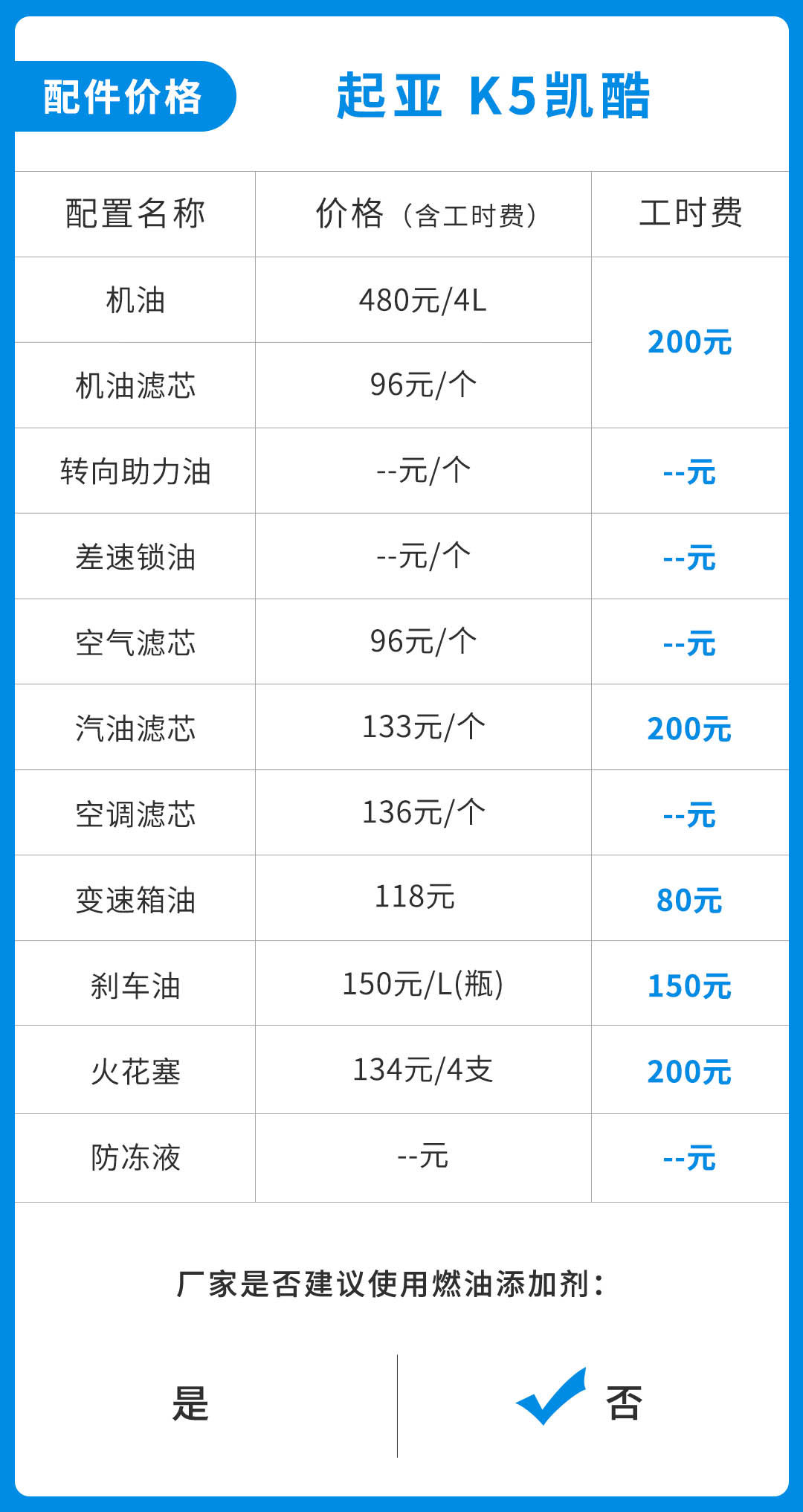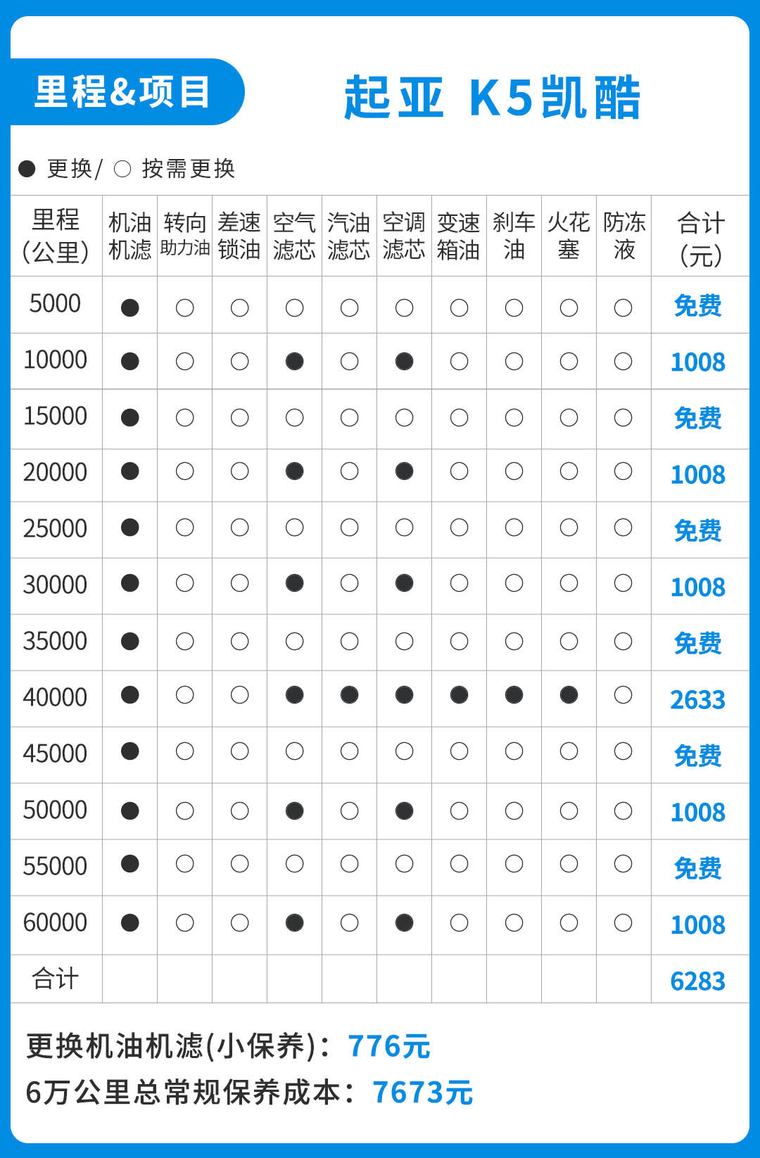 K5凯酷的保养周期是5000公里一保,但是根据销售给到的消息,免费保养一年只能享受2次也就是说如果你每年行驶里程在10000公里左右,基本是不需要为机油机滤的更换掏钱的,但如果像表中统计的标准,一年行驶里程为20000公里的话,每年有两次的机油机滤更换还是需要自行掏腰包。