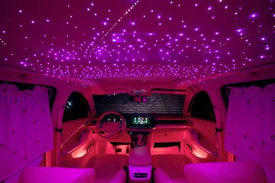 废话不多说,马上进入车内看看,嗯,果然还是熟悉的粉色系,这该死的视觉冲击力,粉色配色遍布车厢全域,座椅、中控、方向盘“无一幸免”,再配搭麂皮车顶和流星式星空顶,以及少女心遮阳帘,总有一种置身于魔仙堡的感觉,整个人都变年轻了呢!