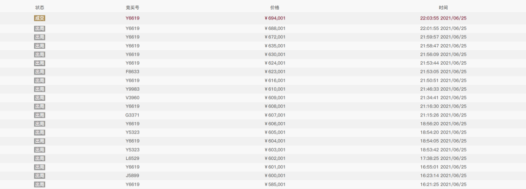 6月25日10点拍卖正式开始,首名买家以 1 元竞拍,仅仅过去5秒,竞拍价就突破了1万元,不到1个小时竞拍价就达到了30万元。但竞拍的势头丝毫没有停止的迹象,买家竞拍节奏反而变得越发紧凑,似乎都想要将冰莓粉旅行改装车据为己有。40万、50万、60万,最终经过长时间的激烈竞价,冰莓粉旅行改装车以694001元成交,时间定格在 6月25日22点03分。