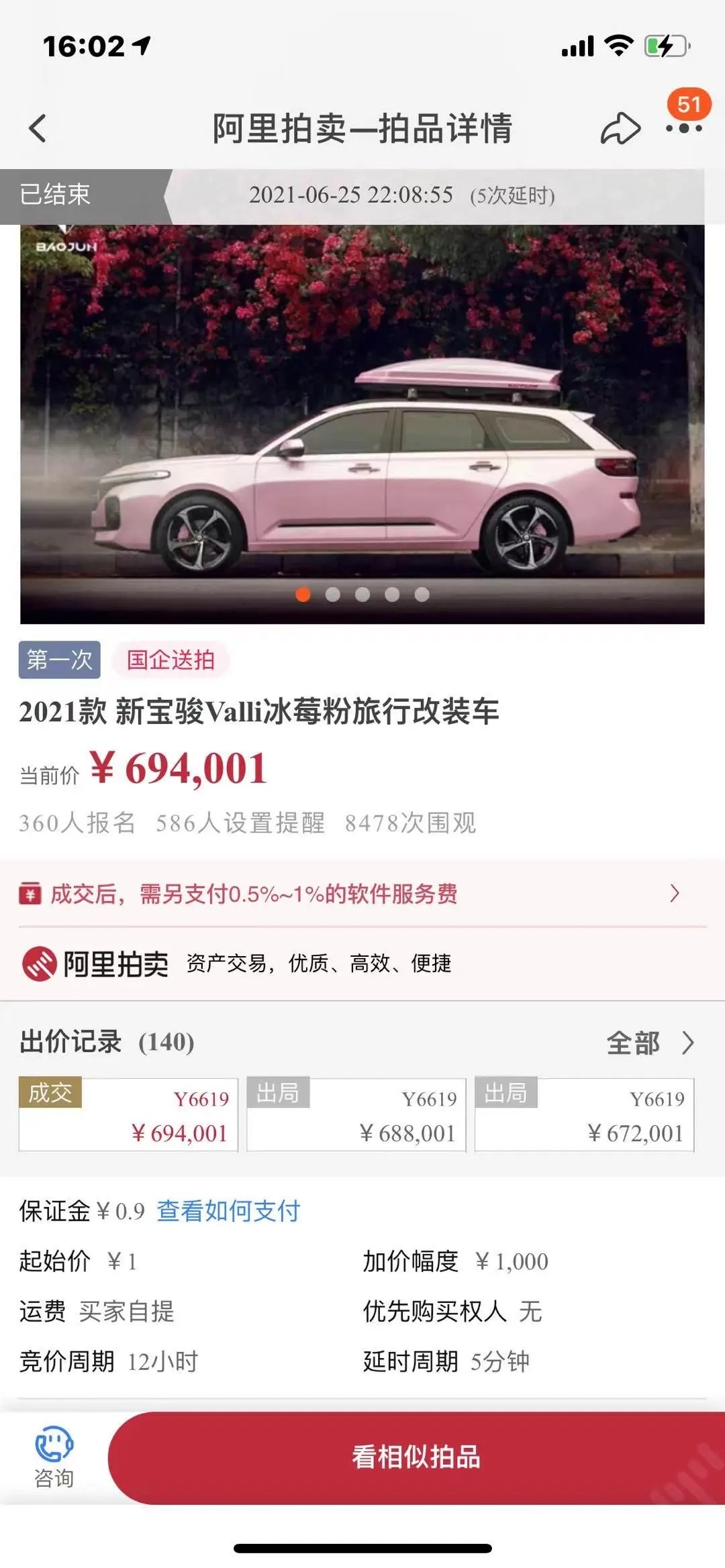 据了解,6月25日,新宝骏Valli冰莓粉旅行改装车在天猫新宝骏汽车官方旗舰店进行线上拍卖。由上汽通用五菱送拍,车辆的出厂时间为2021年3月,表显里程为300公里,排量为1.5T,整车质保三年或6万公里。起拍价为1元,每次加价幅度为1000元,拍卖时长为24小时,最终以694001元价格成交。
