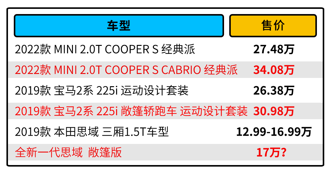 相比于外观内饰和动力,广大消费者或许更在乎售价多少?买买君给大家预测一波,现款在售思域 三厢版1.5T车型售价区间为12.99-16.99万元,结合目前在售MINI COOPER敞篷版与普通版车型差价6-7万元,宝马2系敞篷版与普通版差价在4.5万元左右,可见敞篷版车型售价真不便宜。如果以此类推,全新一代思域敞篷版售价会在17万以上,但考虑到本田的品牌效应,售价在16万左右很合适。