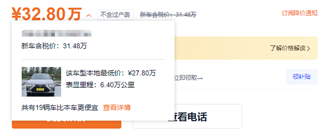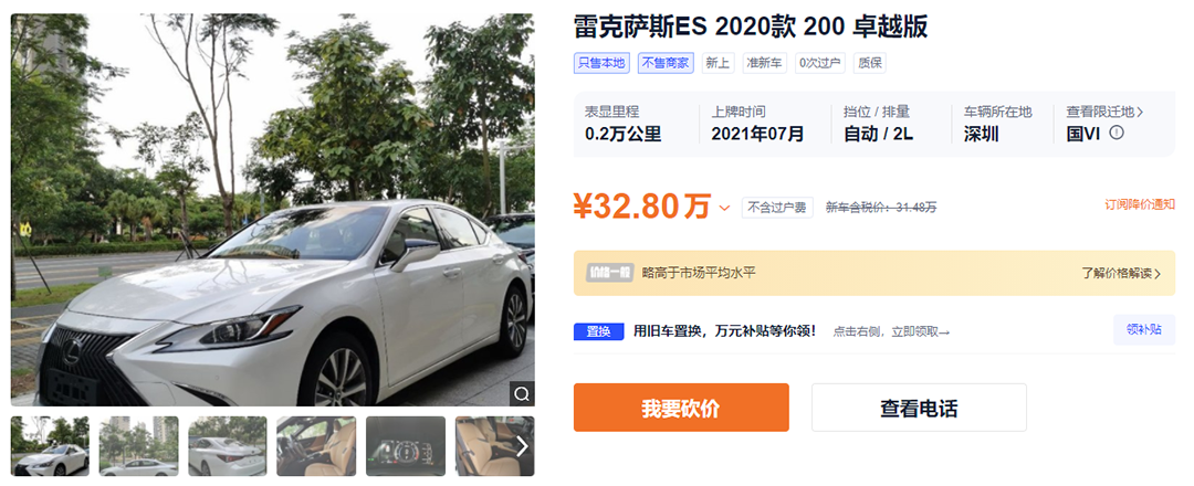 在某二手汽车平台上,同样看到了一台2000公里,今年7月份刚上牌的雷克萨斯ES“准准准新车”,也就是说原车主提车后狠狠开了几天就转手卖出了,但二手车挂价已经有32.8万,这是什么概念?